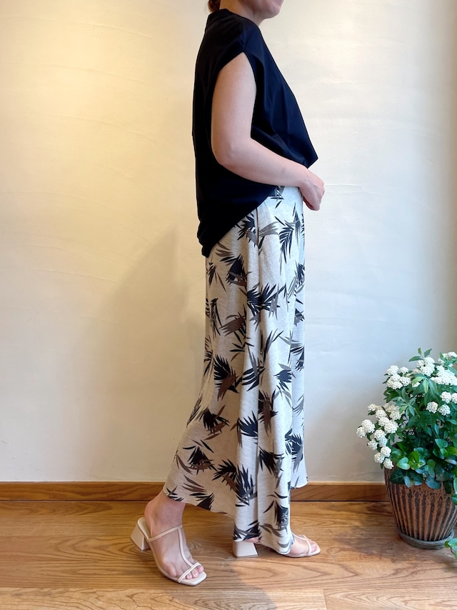 シャリ感の清涼感とストレッチ性も魅力です。夏に向けてぴったりなアースカラーベースで大人な配色に仕上げました。生地の程よい落ち感を活かしたフレアスカート。柄の動きがキレイに表現された1枚です。ヨコストレッチがあるので、前ウエスト周りはすっきりさせてキレイ見え、後ろはゴム仕様でイージーな着用感です。脇にはベンツをあけて動きをプラスしました。シワにもなりにくく、サラッとした着心地で、イージーケアも嬉しいポイントです。