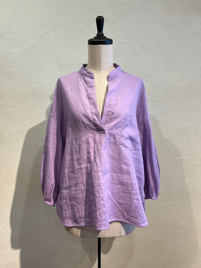 衿のあき具合がシャープで女性らしく、ボリュームたっぷりのパフスリーブがフェミニンなシャツプルオーバーです。リネン100%のシャツ地は、リラックス感を残しつつ、クリーンでクリアなイメージに昇華させた素材感が特徴です。