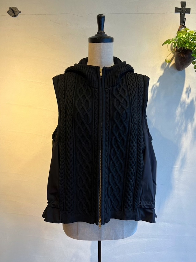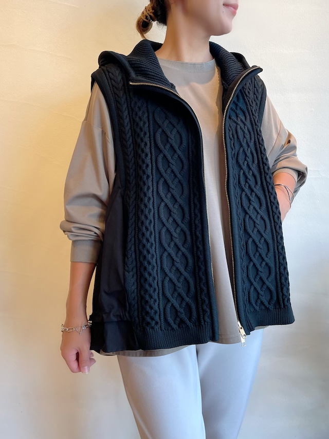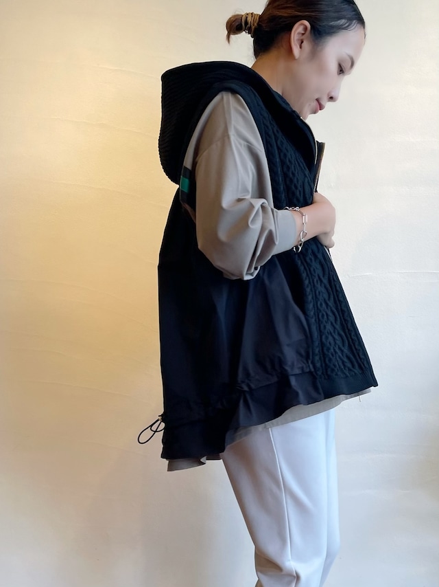 ・適度なストレッチ性と軽量感が特徴のポリエステル糸のニットは着心地がよく、ざっくりした厚みのあるケーブル編みでも重くありません。サイドからバックにかけてのコットンナイロン素材は程よくシャリ感のある丈夫さと軽さが特徴です。