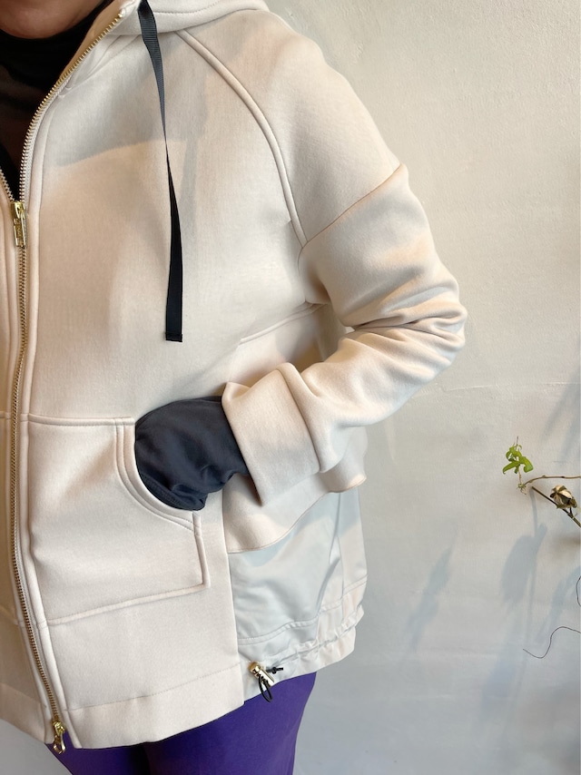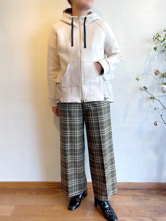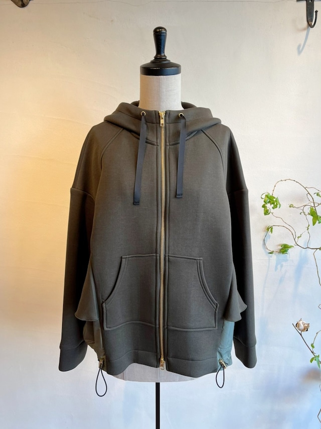 生地感と絶妙なフリル感で、ゆったりカジュアルとふんわりフェミニンのいいとこどりの大人女子におすすめの一枚。シンプルボトムスと合わせるだけで、パッと華やか&お洒落な着こなしに。フード付きブルゾンも、程よい光沢のあるダンボール地を使用しているので上品なコーディネートでお楽しみ頂けます。