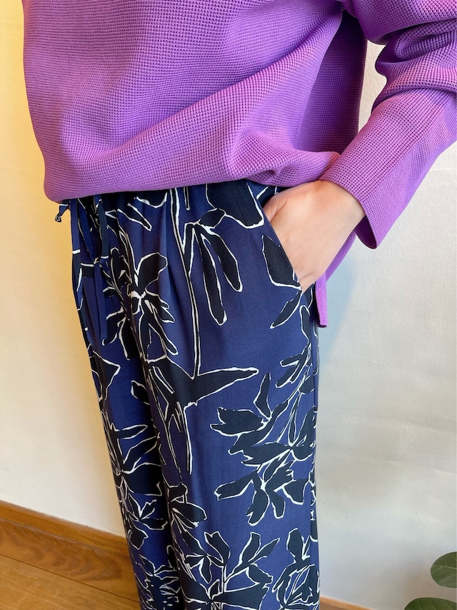 SACRAオリジナルプリントのワイドパンツ。シックなブルーをベースに大胆にレイアウトされたリーフ柄が目を引く。