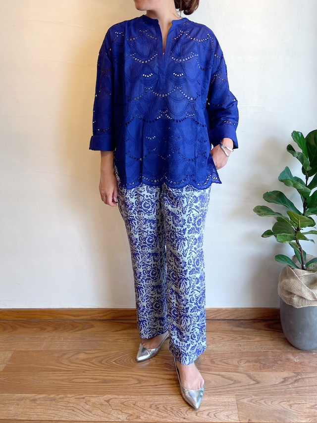 上品な落ち感と光沢が特徴のレーヨンサテンを用いたイージーパンツ。オリジナルのボタニカルモチーフは、ノスタルジックでありつつも甘すぎない配色が〈ne Quittez pas〉らしさ満点です。