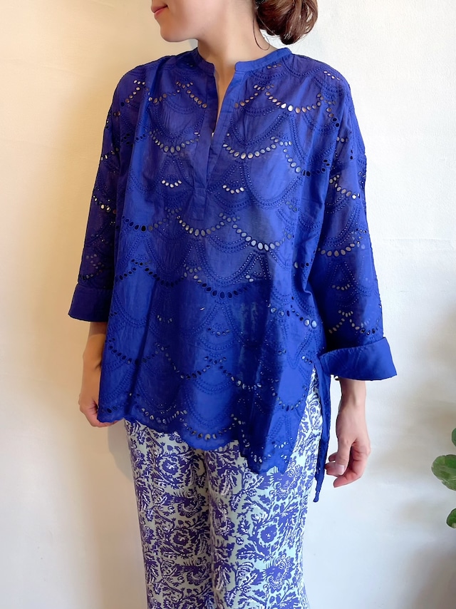 ドットを多用するインドのトライバルアート“ゴンド”にインスパイアされたオリジナルモチーフを、繊細なヘムラ刺しゅうで表現。