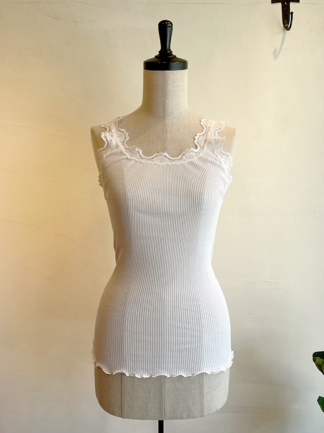 色々なお洋服のインナーとして重宝するワードローブに一枚は持っていたいアイテム。デンマーク産のレースが上品で高級感があり、シルクメインの高品質素材で、肌触りの良さは定評があります。ストレッチがかなり効いているのでどんな体形の方にも対応。