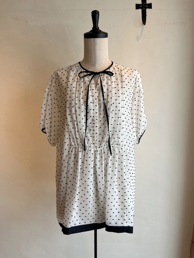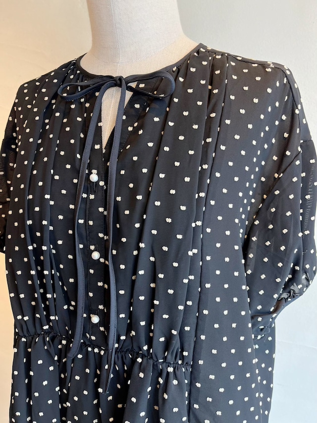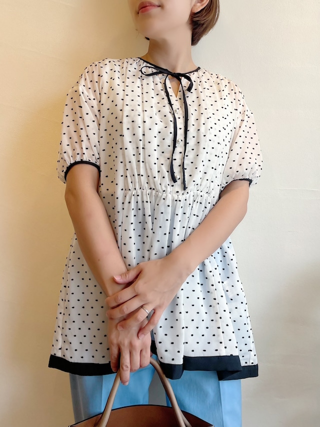 サラッとした肌ざわりが心地よく、キュプラ混の上品な光沢感が清楚でフェミニンな印象を与えてくれるドットブラウスです。