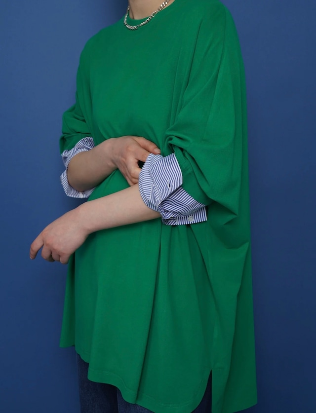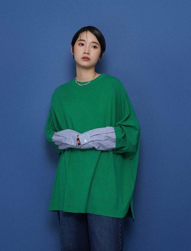 重ね着をしたようなシャツスリーブは一枚でも重ね着でも様々なコーデに楽しめます。身頃は滑らかなカットソー素材なのでインもしやすく、お袖口のドッキングはコートやニットから覗かせるのもお洒落ポイント。落ち感のあるウォーム素材でルーズながらもカジュアルすぎないシルエットです。