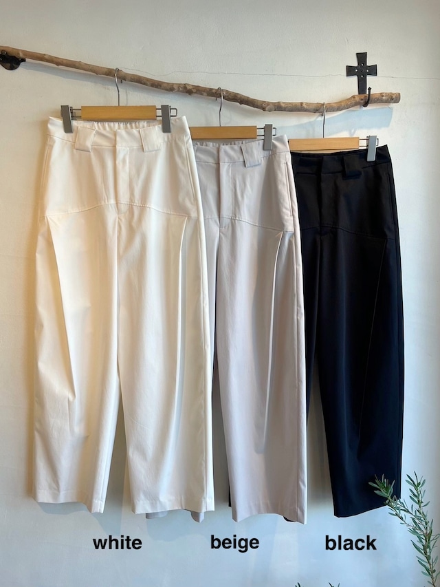 身体のラインを拾いにくく、すっきりとしたシルエット。撥水素材なので、雨の日にも着用にもおすすめ。ヒップ部分のベルトが目を惹くワンポイントに。モードとカジュアルを両立させた至高のパンツです。
